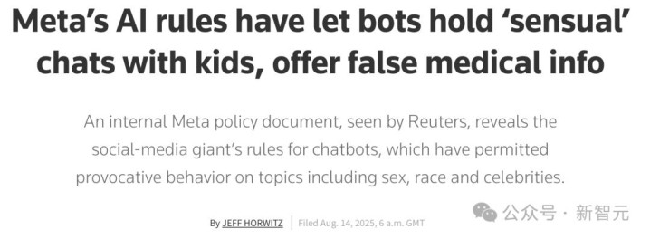 2025年8月,Meta内部政策文档被曝光:允许AI聊天机器人与未成年人进行「感性」等话题互动,提供虚假医疗信息。