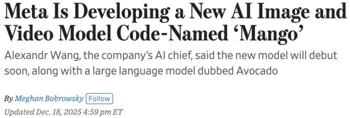 最近,Meta被爆出正在开发图像和视频生成AI模型「Mango」。与此同时,还有一款大语言模型「Avocado」。